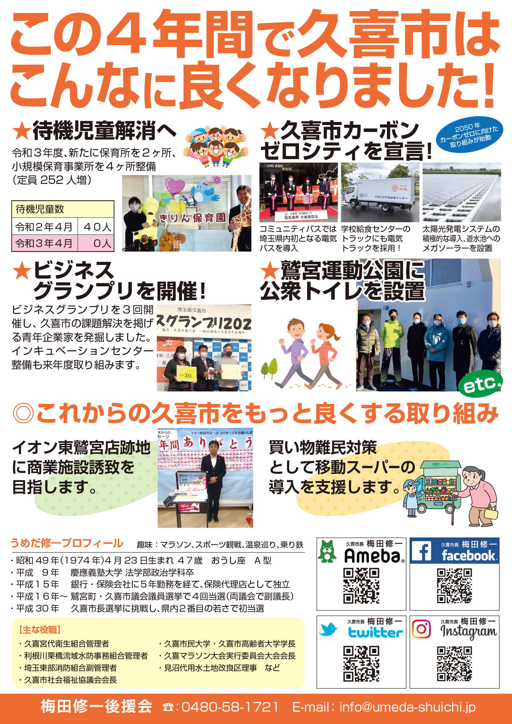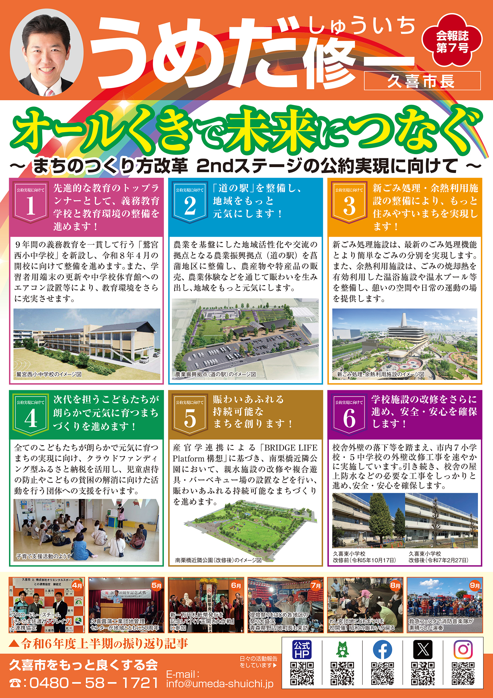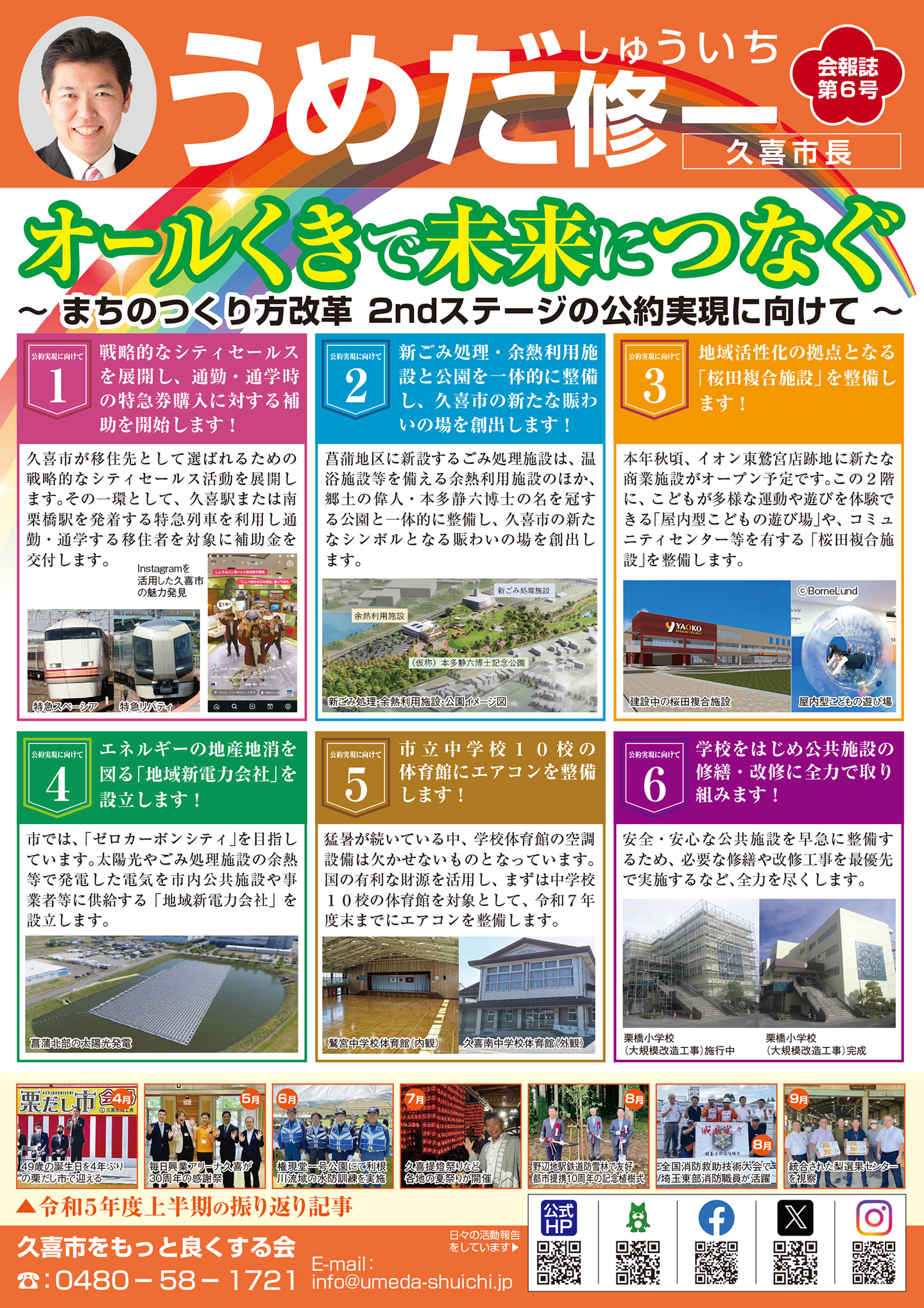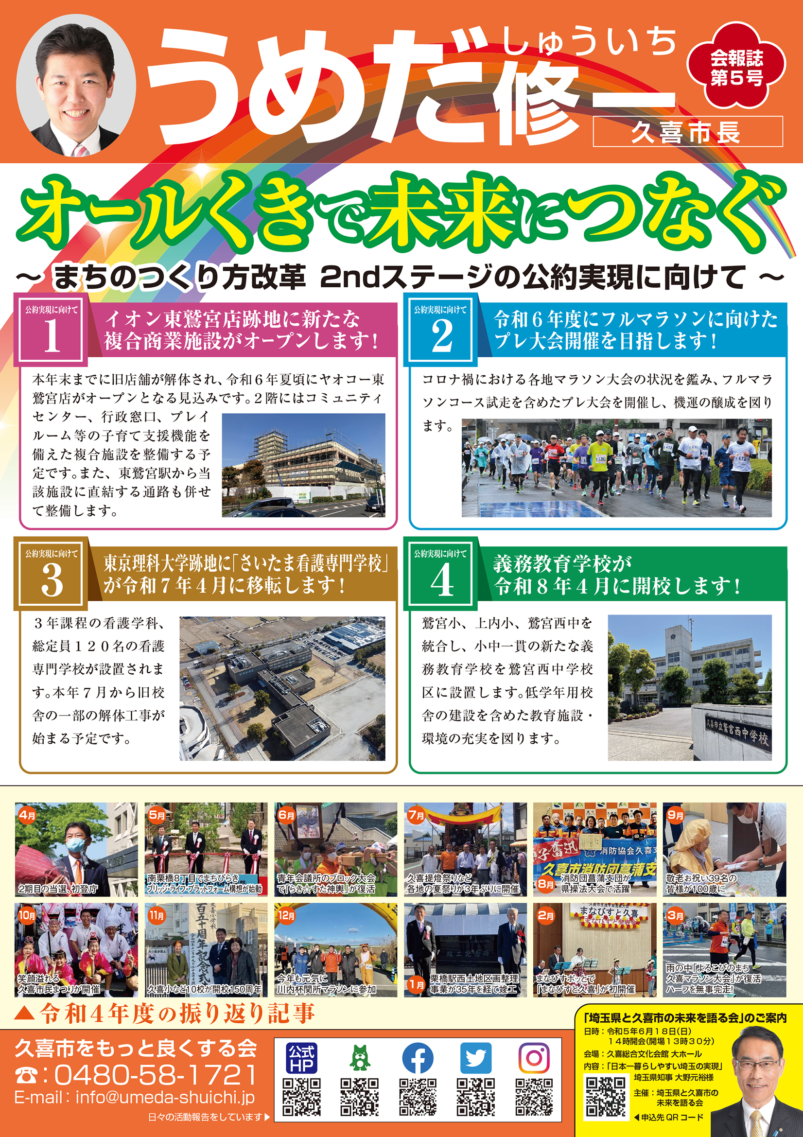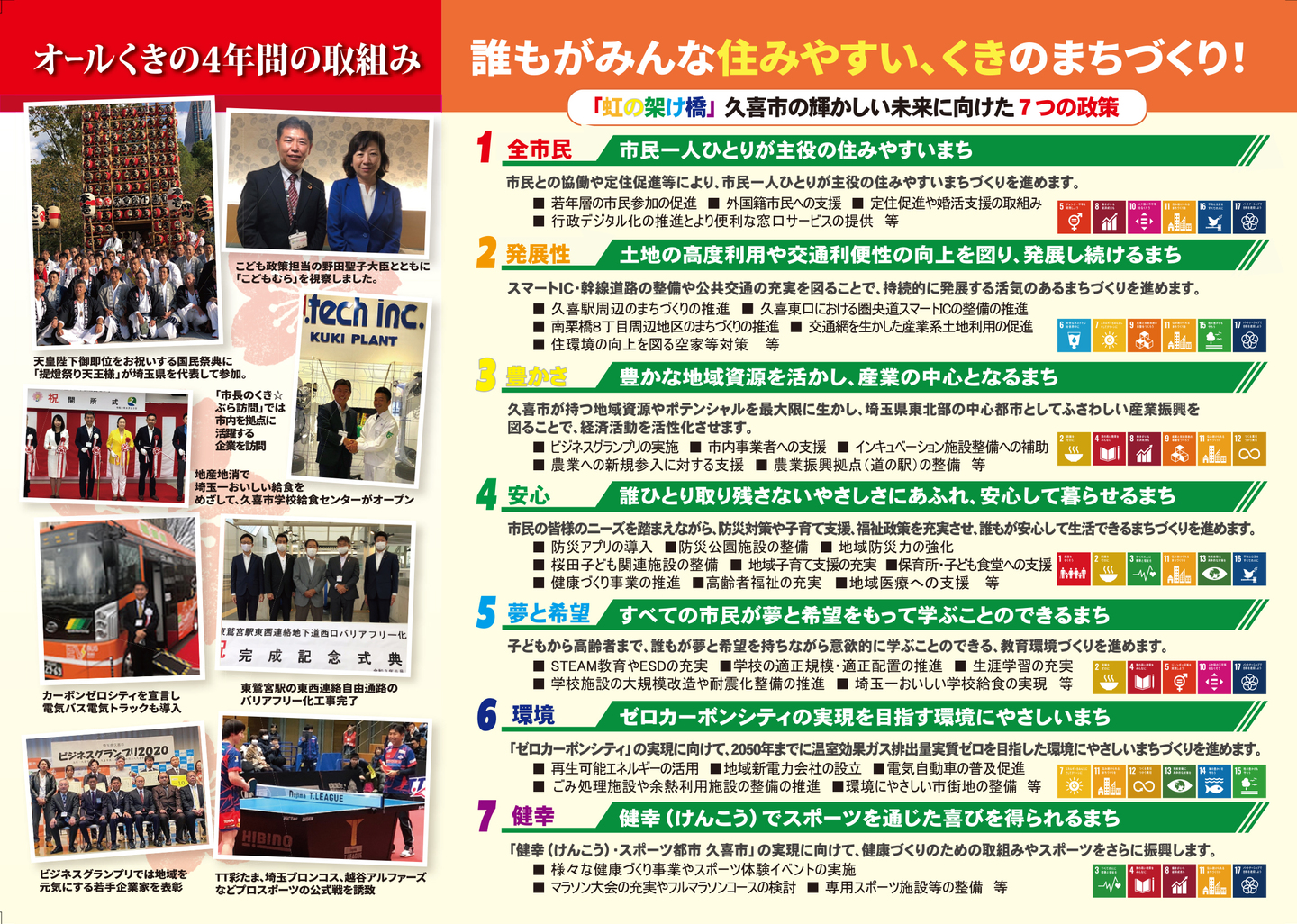 広報紙 オールくきの4年間の取組み 天皇陛下御即位をお祝いする国民祭典に「提燈祭り天王様」が埼玉県を代表して参加。 こども政策担当の野田聖子大臣とともに「こどもむら」を視察しました。 地産地消で埼玉一おいしい給食をめざして、久喜市学校給食センターがオープン。 「市長のくき☆ぶら訪問」では市内を拠点に活躍する企業を訪問。 カーボンゼロシティを宣言し電気バス電気トラックも導入。 東鷲宮駅の東西連絡自由道路のバリアフリー化工事完了。 ビジネスグランプリでは地域を元気にする若手起業家を表彰。 TT彩たま、埼玉ブロンコス、越谷アルファーズなどプロスポーツの公式戦を誘致。