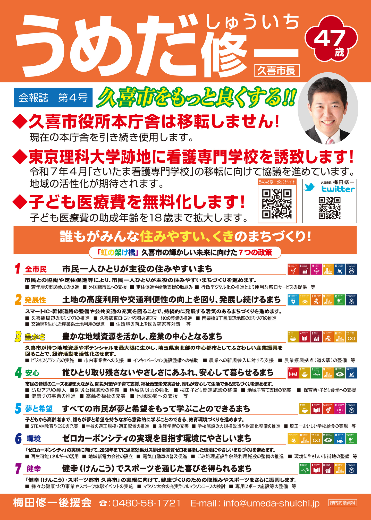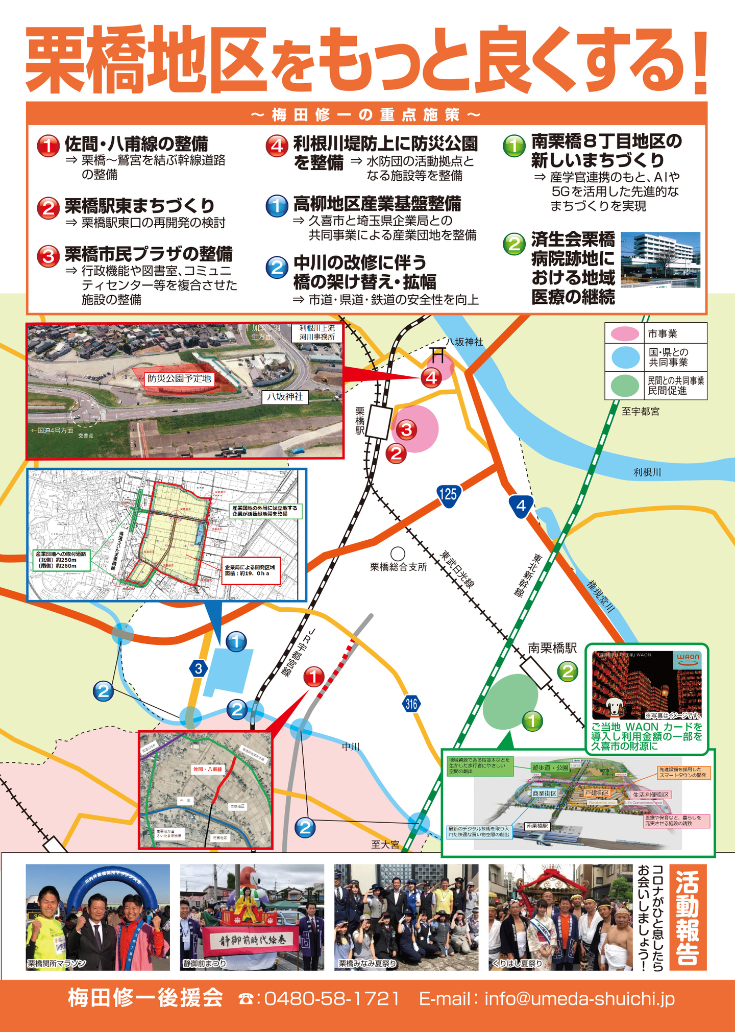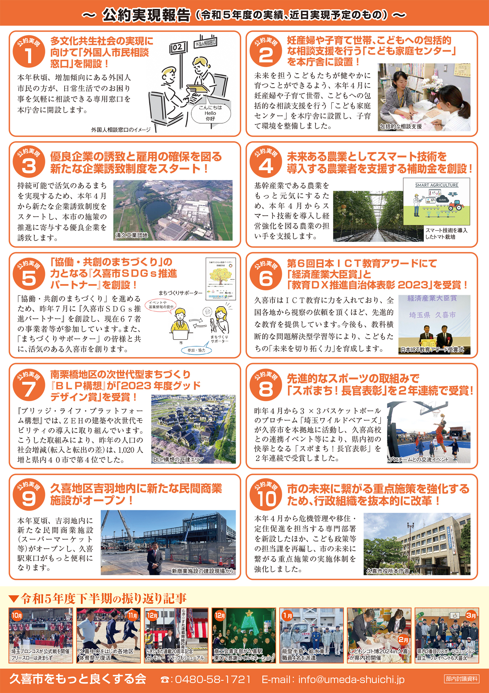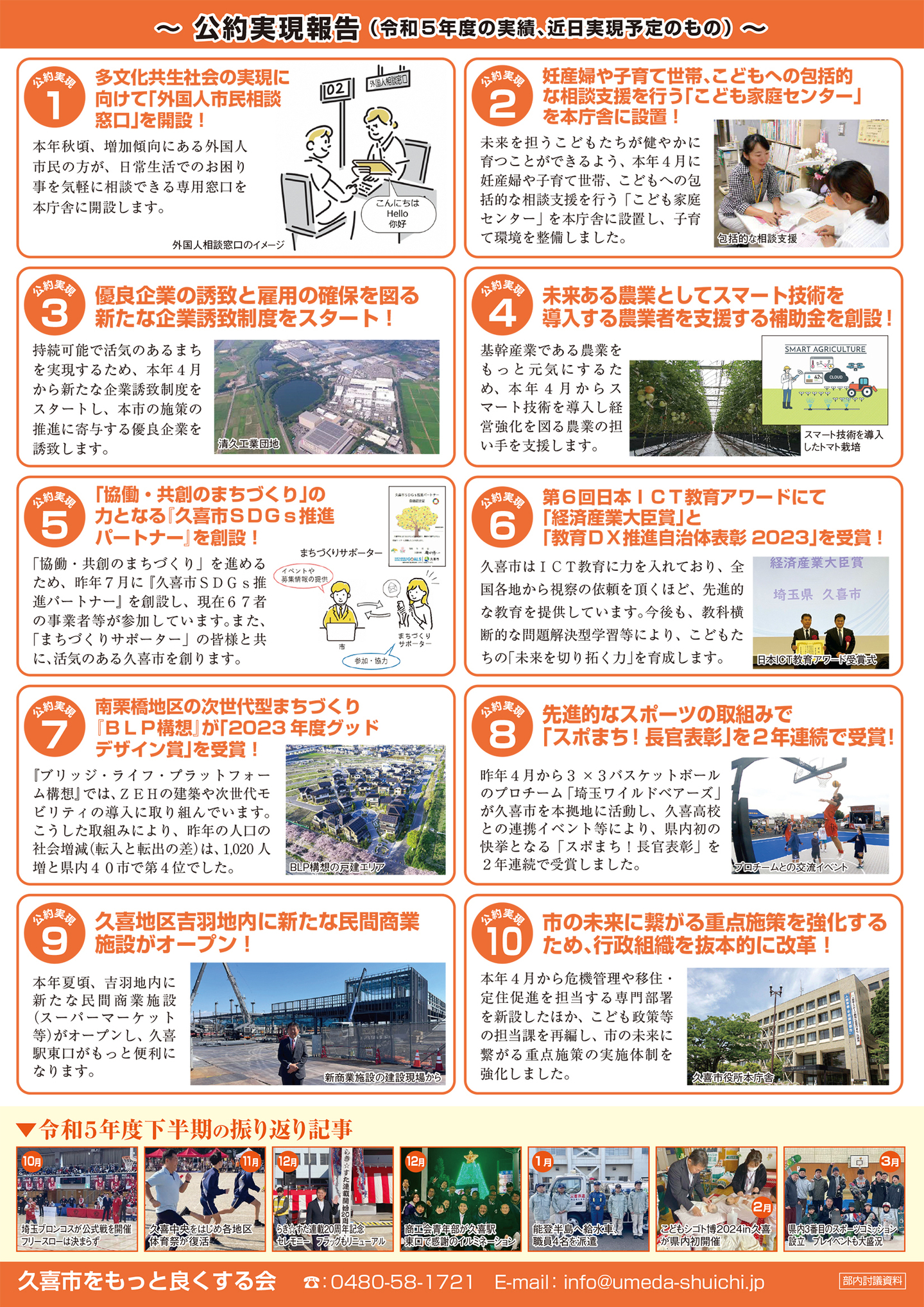 広報紙 オールくきの4年間の取組み 天皇陛下御即位をお祝いする国民祭典に「提燈祭り天王様」が埼玉県を代表して参加。 こども政策担当の野田聖子大臣とともに「こどもむら」を視察しました。 地産地消で埼玉一おいしい給食をめざして、久喜市学校給食センターがオープン。 「市長のくき☆ぶら訪問」では市内を拠点に活躍する企業を訪問。 カーボンゼロシティを宣言し電気バス電気トラックも導入。 東鷲宮駅の東西連絡自由道路のバリアフリー化工事完了。 ビジネスグランプリでは地域を元気にする若手起業家を表彰。 TT彩たま、埼玉ブロンコス、越谷アルファーズなどプロスポーツの公式戦を誘致。