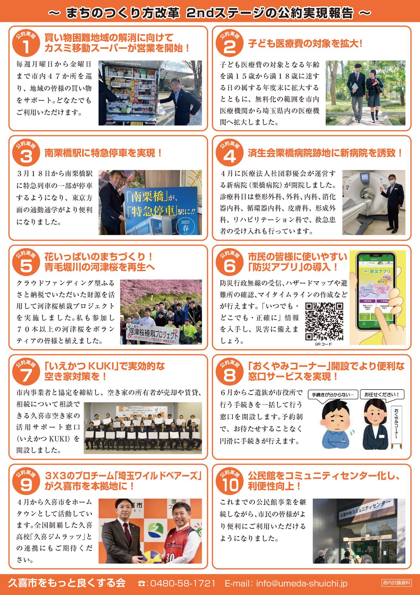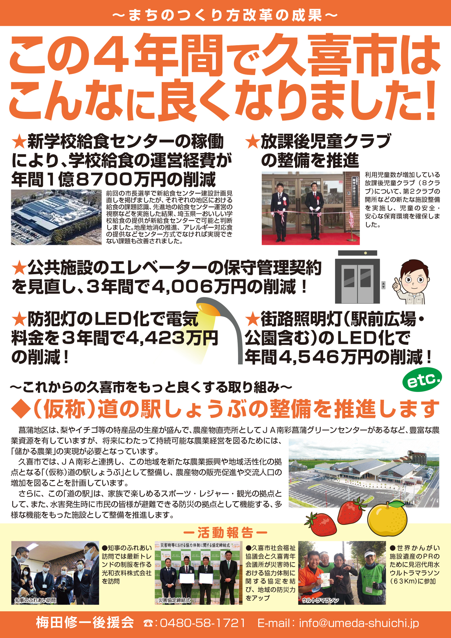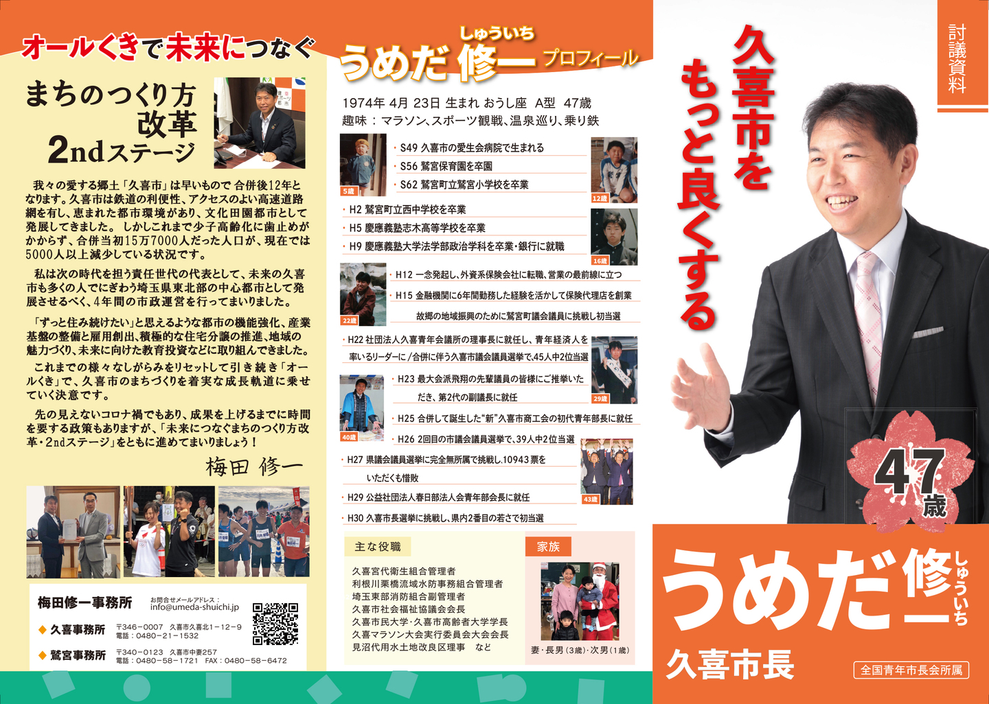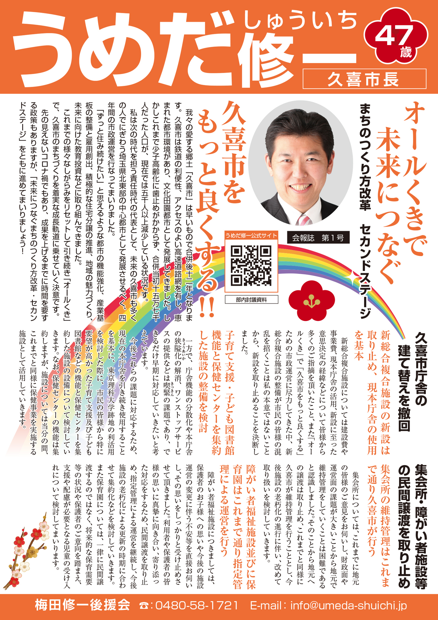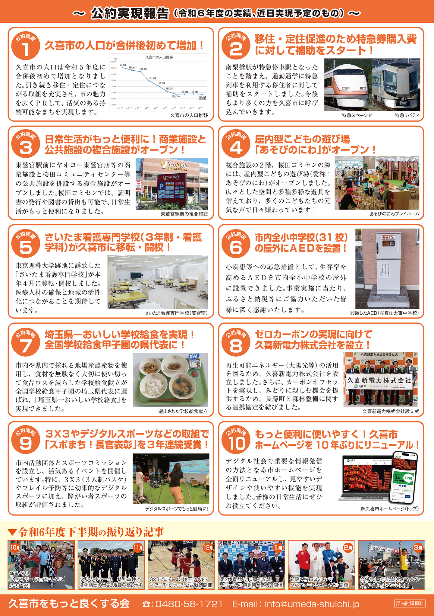 広報紙 オールくきの4年間の取組み 天皇陛下御即位をお祝いする国民祭典に「提燈祭り天王様」が埼玉県を代表して参加。 こども政策担当の野田聖子大臣とともに「こどもむら」を視察しました。 地産地消で埼玉一おいしい給食をめざして、久喜市学校給食センターがオープン。 「市長のくき☆ぶら訪問」では市内を拠点に活躍する企業を訪問。 カーボンゼロシティを宣言し電気バス電気トラックも導入。 東鷲宮駅の東西連絡自由道路のバリアフリー化工事完了。 ビジネスグランプリでは地域を元気にする若手起業家を表彰。 TT彩たま、埼玉ブロンコス、越谷アルファーズなどプロスポーツの公式戦を誘致。