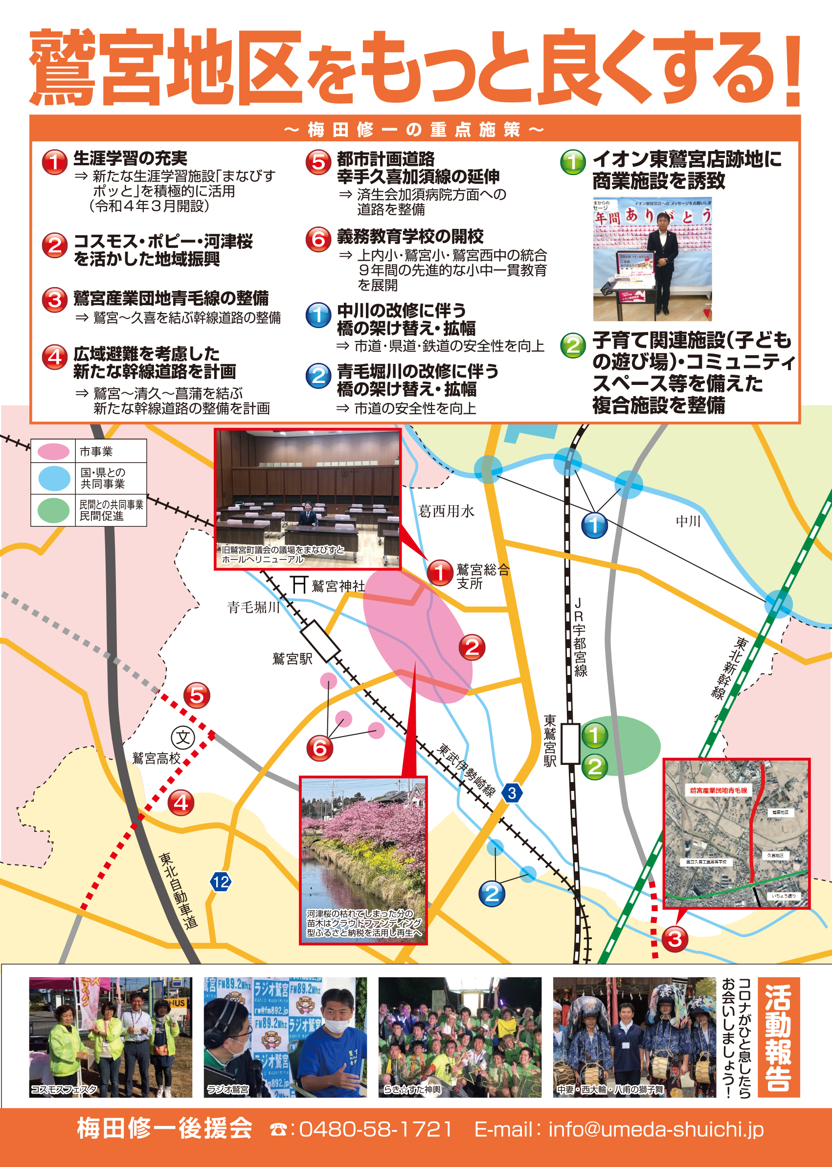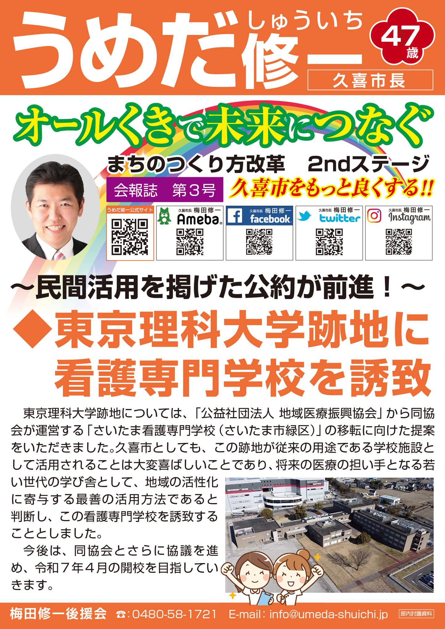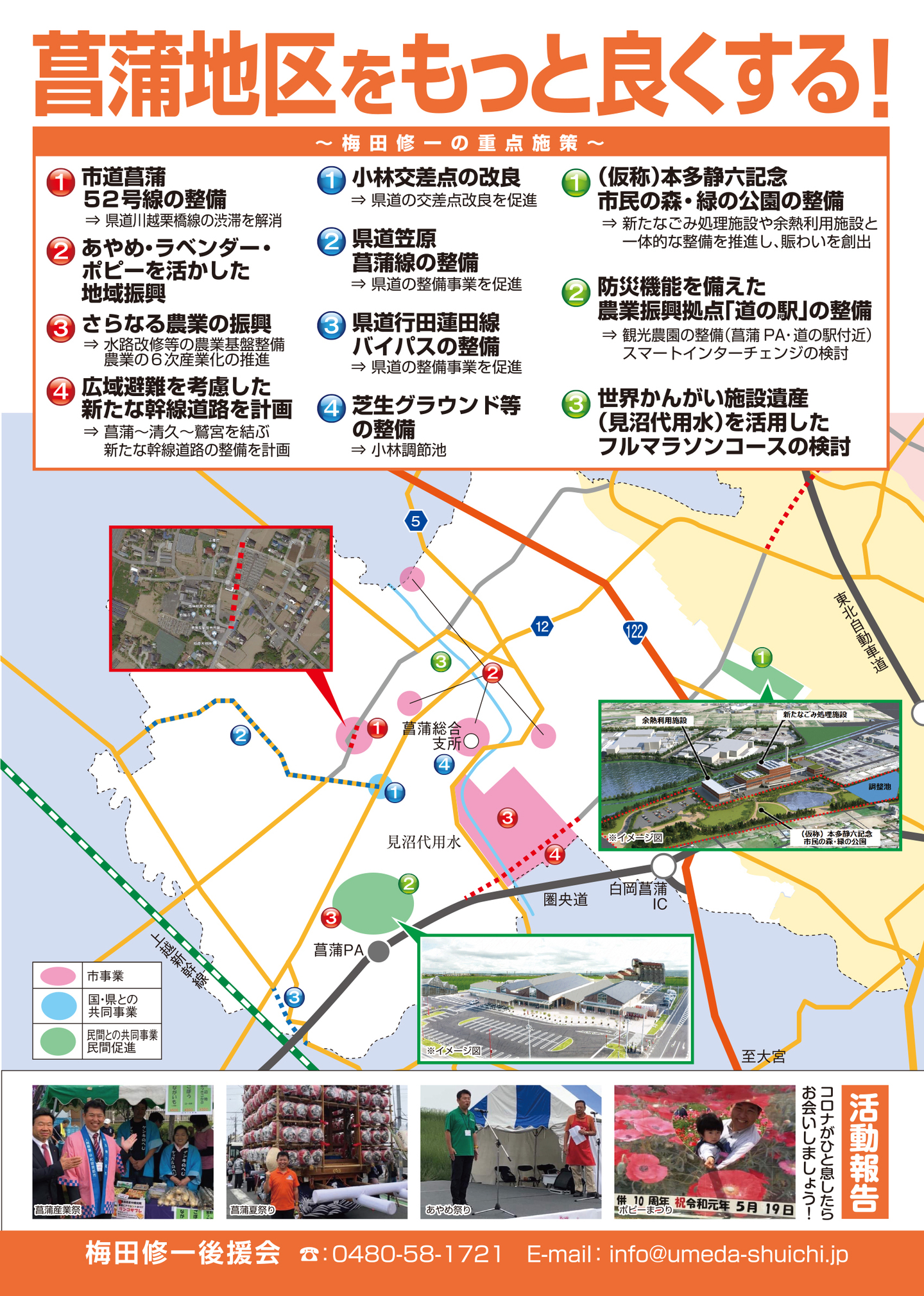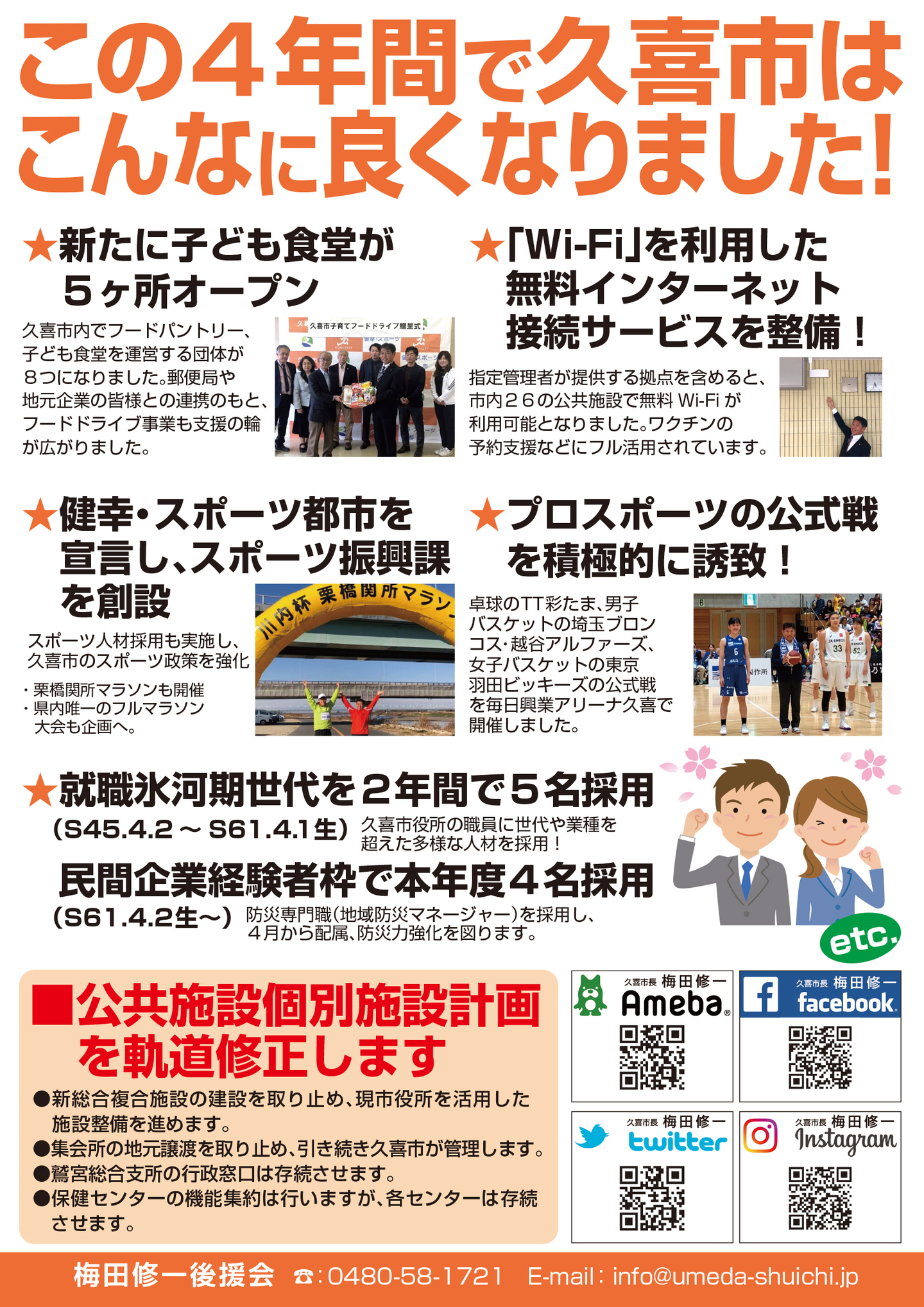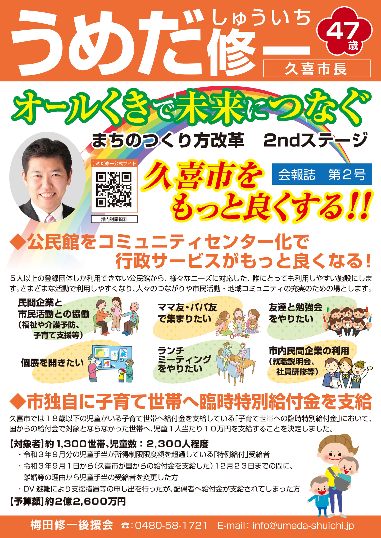 広報紙 オールくきの4年間の取組み 天皇陛下御即位をお祝いする国民祭典に「提燈祭り天王様」が埼玉県を代表して参加。 こども政策担当の野田聖子大臣とともに「こどもむら」を視察しました。 地産地消で埼玉一おいしい給食をめざして、久喜市学校給食センターがオープン。 「市長のくき☆ぶら訪問」では市内を拠点に活躍する企業を訪問。 カーボンゼロシティを宣言し電気バス電気トラックも導入。 東鷲宮駅の東西連絡自由道路のバリアフリー化工事完了。 ビジネスグランプリでは地域を元気にする若手起業家を表彰。 TT彩たま、埼玉ブロンコス、越谷アルファーズなどプロスポーツの公式戦を誘致。
