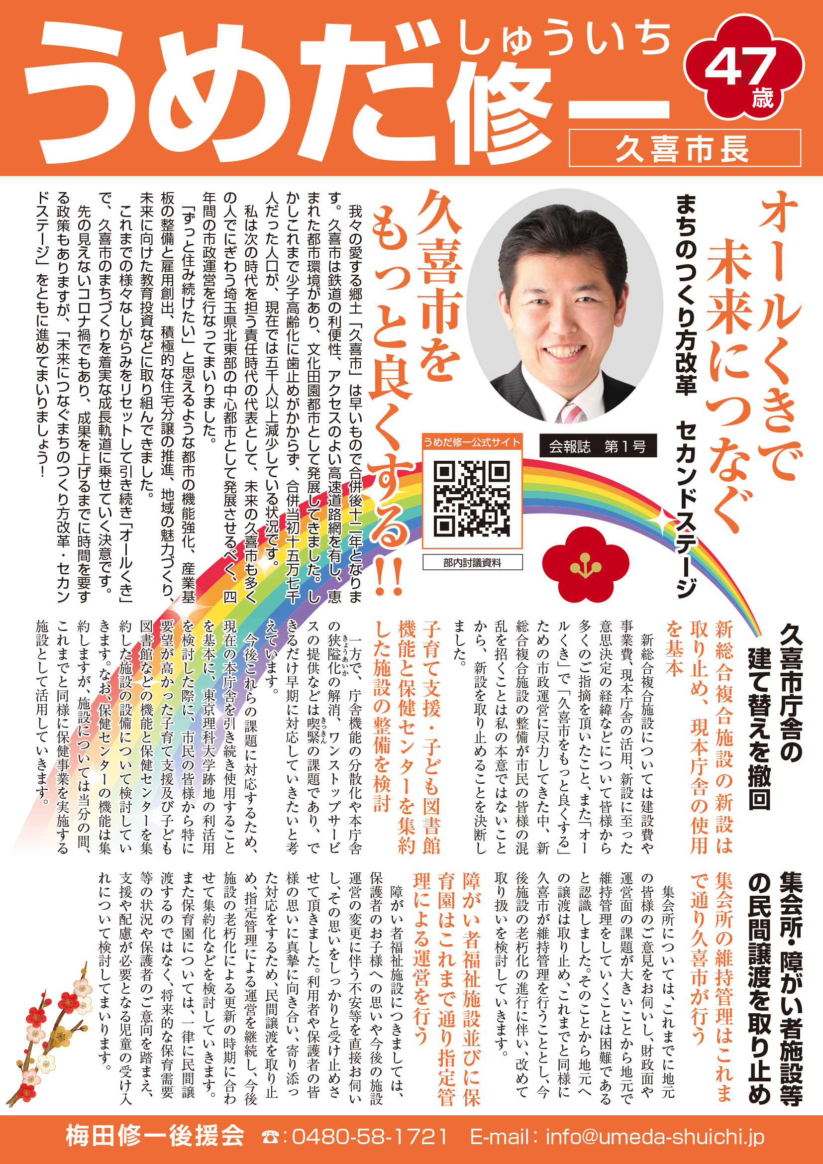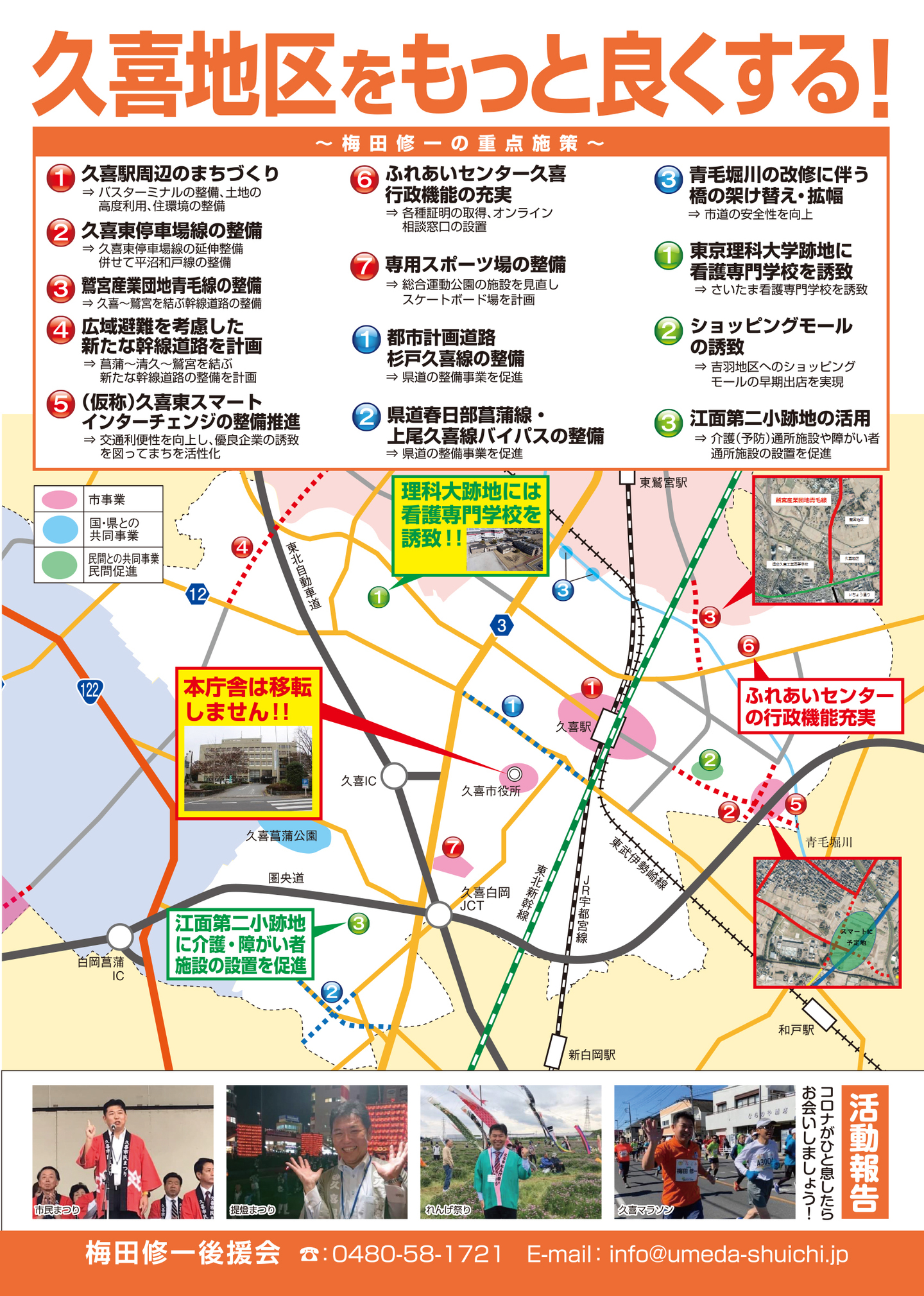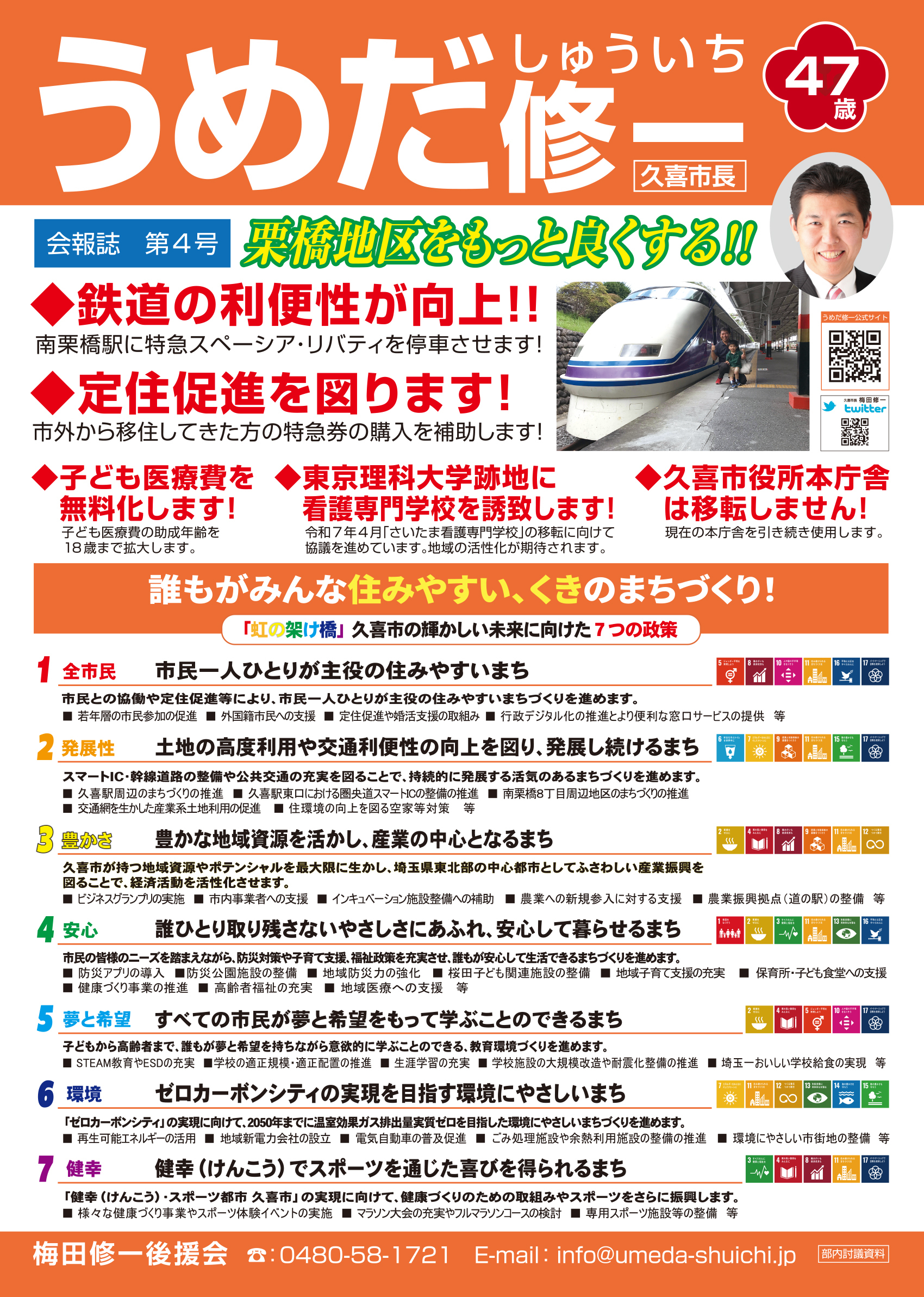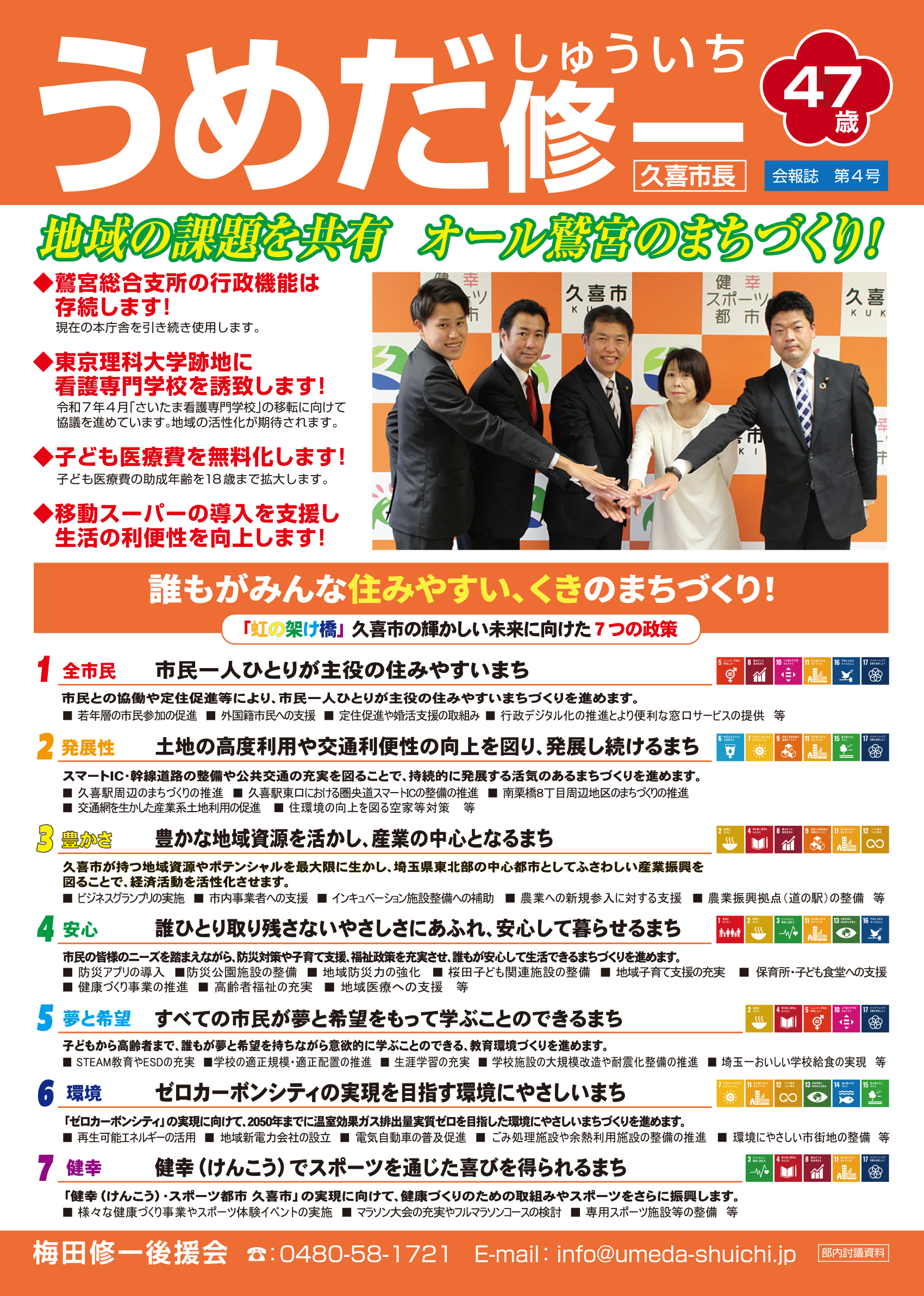 広報紙 オールくきの4年間の取組み 天皇陛下御即位をお祝いする国民祭典に「提燈祭り天王様」が埼玉県を代表して参加。 こども政策担当の野田聖子大臣とともに「こどもむら」を視察しました。 地産地消で埼玉一おいしい給食をめざして、久喜市学校給食センターがオープン。 「市長のくき☆ぶら訪問」では市内を拠点に活躍する企業を訪問。 カーボンゼロシティを宣言し電気バス電気トラックも導入。 東鷲宮駅の東西連絡自由道路のバリアフリー化工事完了。 ビジネスグランプリでは地域を元気にする若手起業家を表彰。 TT彩たま、埼玉ブロンコス、越谷アルファーズなどプロスポーツの公式戦を誘致。